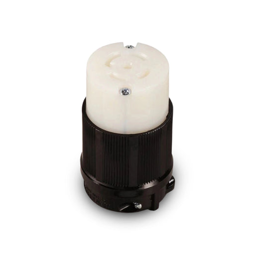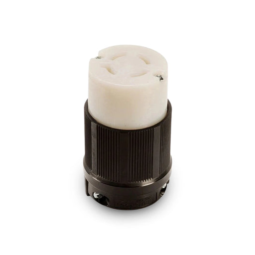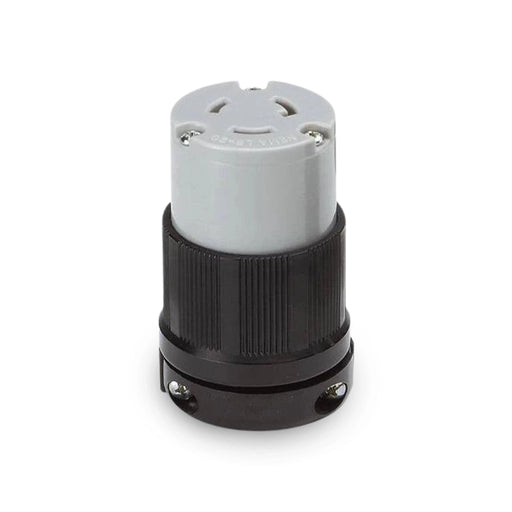 Industrial grade Grounding Locking Connector with 2 poles and 3 wires. NEMA designation, amperage, voltage and certification molded on face of device.