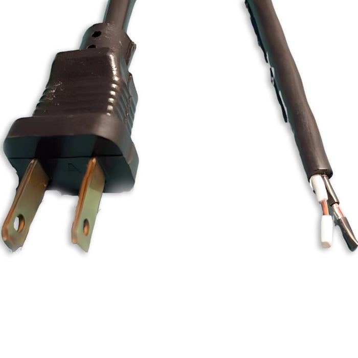 This industry standard 1ft 6in power cord is made for the North American market.  The cord is black PVC thermoplastic SJTW in 18 gauge 2 conductor.  The male end is quality molded with a Nema 1-15Plug that is polarized so that the cord will only fit in one way.  The female end is open with the outer jacket removed or “ROJ” 1 inches with the ends stripped 1/4 inch.  Perfect for indoor or outdoor use.