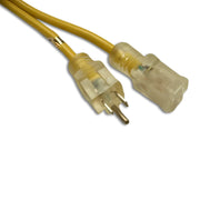 Specifications: This power extension cord or power extension cable has connectors for the North American (NA) market. It features a molded NEMA 5-15P plug to a NEMA 5-15R Lighted receptacle. 14 gauge 3 conductor SJTW type wire, 50 feet in length, yellow in color, rated to 15 amperages and 125 volts. Temperature rating is 105°C.