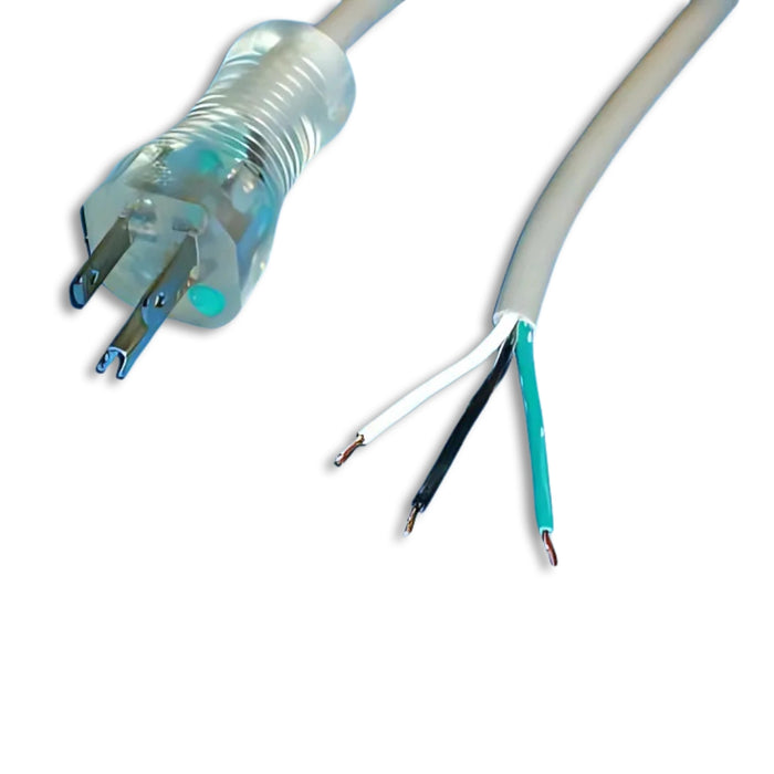 This industry standard 8ft hospital grade power cord is made for the North American market. The cord is gray PVC thermoplastic SJTW cable in 14 gauge 3 conductors. The male end is quality molded with a clear Nema 5-15 hospital plug with green dot. The female end is open with the outer jacket removed or “ROJ” 2 inches with the ends stripped 1/4 inch. This cord is perfect for medical grade use.