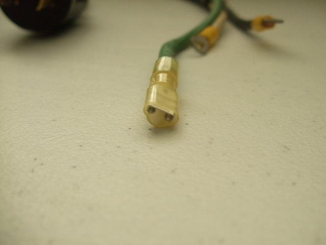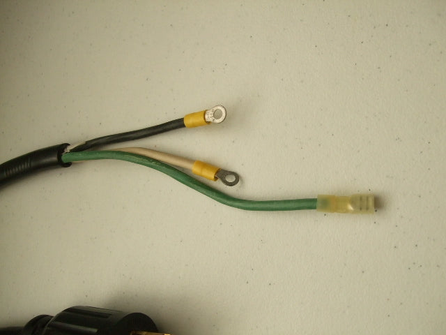 Specifications:   This heavy-duty power cord or heavy-duty power cable has connectors for the North American (NA) market. It features a molded NEMA L6-30P locking plug to an ROJ and Terminals. The black and white are both fitted with a #10 ring and shortened to 4" while the green has a ROJ of 7" and fitted with 1/4" insulated Quick connect. 10 gauge 3 conductor SOOW type rubber wire, 12 feet in length, black in color, rated to 30 amperages and 250 volts. Temperature rating is 90°C.