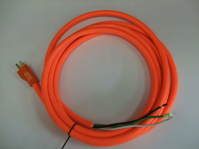 This industry standard 15ft power cord is made for the North American market. The cord is Bright Orange PVC thermoplastic STOW in 14 gauge 3 conductors 18 Amp 600 V. The male end is quality molded with a Nema 5-15Plug. The female end is open with the outer jacket removed or “ROJ" 6 1/2" Black and White conductors striped 3/8" Green conductor fitted with an insulated Amp #10 ring. This cord is perfect for indoor or outdoor use.