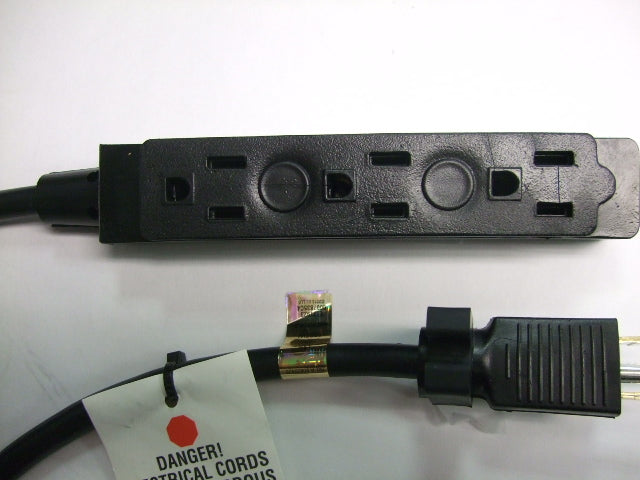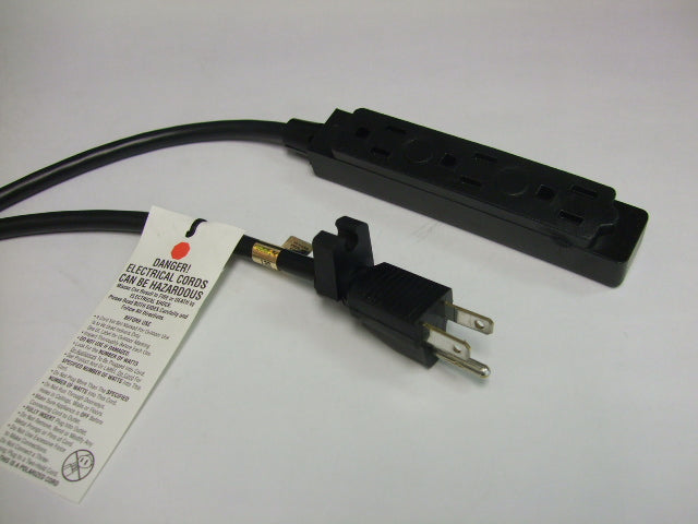 This extension cord or extension cable has standard connectors for North American market. It features a molded on Nema 5-15PCL (Male) plug with a Cord Lock( not pictured) to a Nema 5-15TT Triple Connector (3-Outlet). 16 gauge SJTW type wire, 3 conductors, 20 feet in length, Black in color. It is rated up to 13 amperages and 125 volts. Also, it has a temperature rating of up to 105°C.